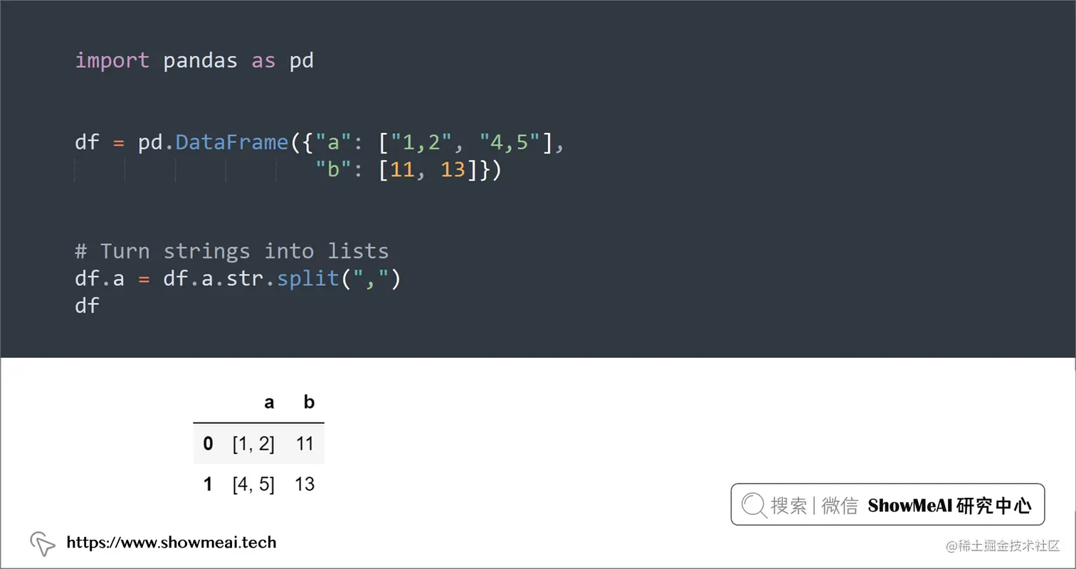 类似于上例,如果你想把一个DataFrame中某个字符串字段(列)展开为一个列表,然后将列表中的元素拆分成多行,可以使用str.split()和explode()组合,如下例: