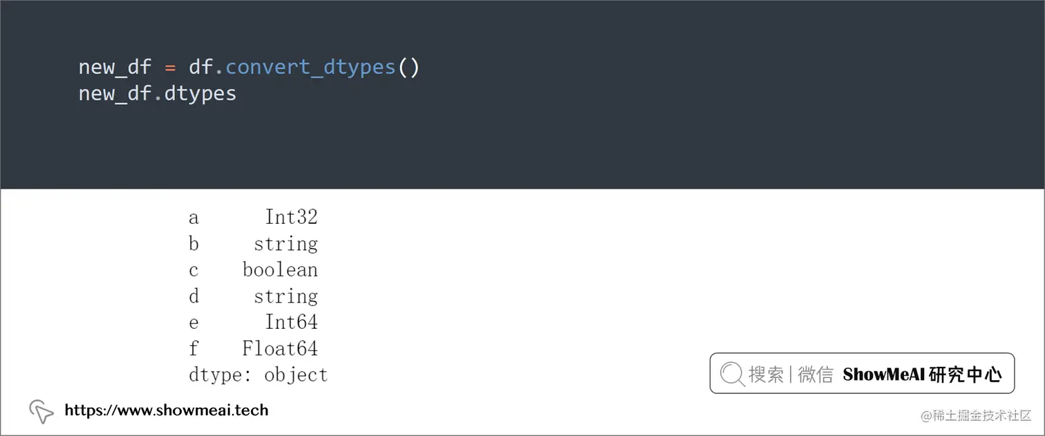 对于 DataFrame 中的列,我们可以调整其数据类型,使用convert_dtypes()可以快速将它转换为我们需要的数据类型。