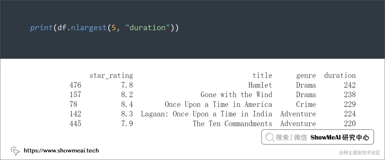 如果我们需要对数据字段进行排序,可以使用.sort_values(),但是它会对所有数据排序,如果我们要获取最大或者最小的 n 个数,可以利用.nlargest()和.nsmallest()。
