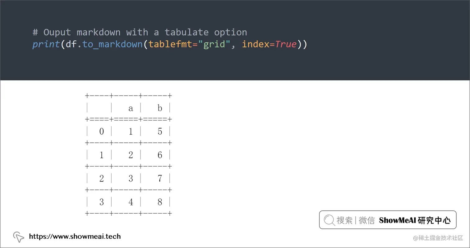 df.to_markdown("README.md", tablefmt="grid", index=True)