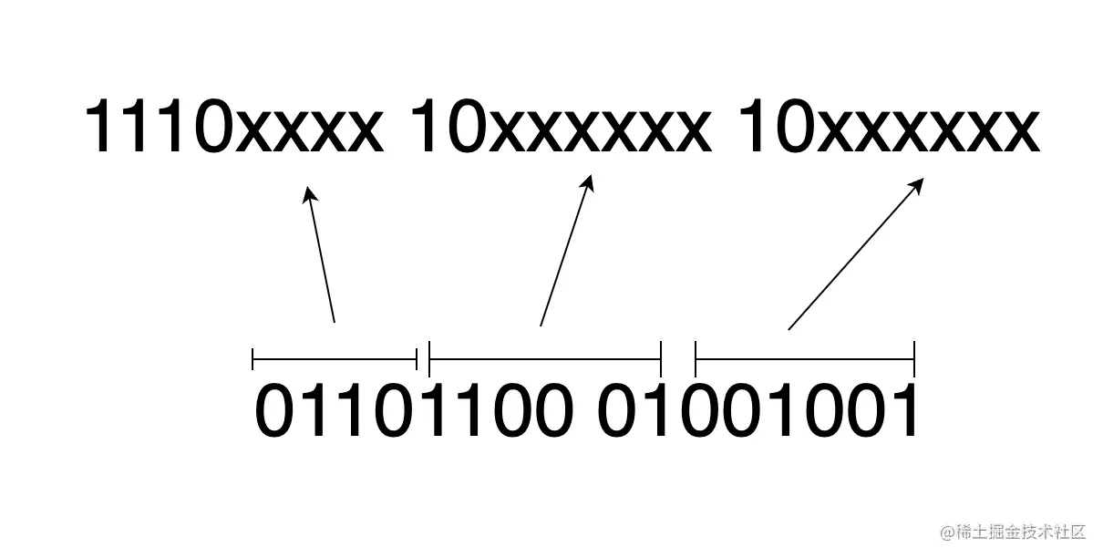如上图的方式对 汉 进行编码,结果为 11100110 10110001 10001001