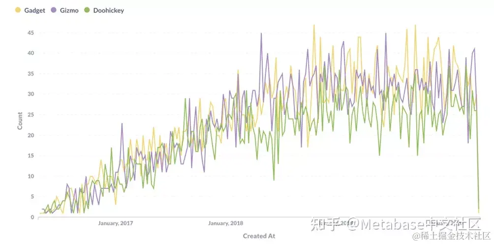 不过,查询并不一定要到此为止:Metabase允许您一步一步地添加更多的过滤器和计算更多的摘要。为了了解这是如何工作的,让我们跟踪分析人员可能要经历的步骤,同时探究每种类别的商品每周售出多少。