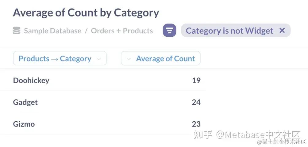 还有其他方法可以计算这个结果:例如,我们可以在计算第一个摘要之前过滤掉小部件(大多数分析师认为这是一个最佳实践,因为在早期减小数据集的大小可以提高性能)。重要的一课是,我们可以一步一步地构建洞察力,因为每个答案都指向一个新问题,而Metabase允许我们在操作发生时逐个添加操作。我们不必事先计划好所有事情:如果我们发现我们总是从相同的操作开始,我们可以单独保存这些操作,如本文所述SQL代码片段与保存的问题与视图.