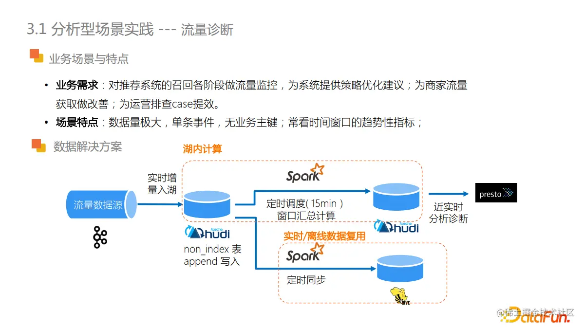 针对这类场景,数据湖方案就体现出了其处理海量数据的适用性。在解决方案中,是将流量数据增量入湖,以append的方式写入non_index类型的湖表,定时15分钟调度进行窗口汇总计算,通过 Presto 支持近实时分析诊断。对于更复杂的计算或者离线的业务需求,也可以定时同步到Hive表,在满足了近实时分析的同时,也实现了离线的复用。