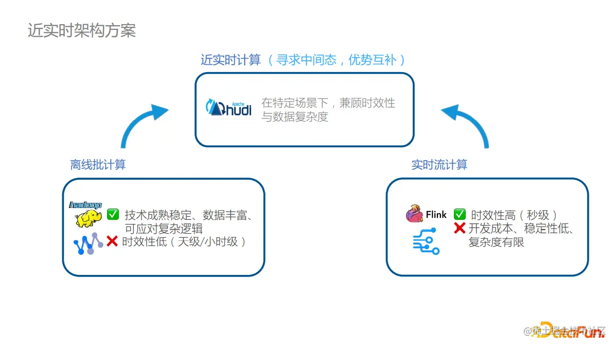 我们探索的近实时架构时,并没有选择业界比较流行的批流一体方案,而是在流式计算和批式计算中间寻求优势互补的中间态。虽然当前业界在计算引擎层面做到了流批一体,但是,在实际的数据生产加工过程中,在数据质量、数据运维、血缘管理、开发套件等方面,实时计算、离线计算客观上存在着较大差异。