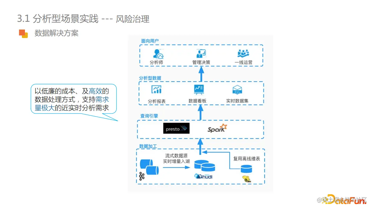 其次,风险治理需要关联多个数据域,进行整体的风险排查。比如推断疑似黑灰产商家,需要查验资质信息、举报信息或者交易的信息。在分析的过程中,需要关联很多离线维表来获取商家的资质、等级、评分等信息,再做最终的预判。这类需求特点和近实时分析所支持的场景是相吻合的。因此,可采用基于数据湖的解决方案,利用数据湖的海量低加工的数据处理特性,将多数据源实时增量入库,避免过多的 join 或者是汇总计算,同时又把离线的表去做复用。整体直接面向查询引擎,由用户去决定在查询分析时候的 schema ,也就是转化为 schema on read 的模式。