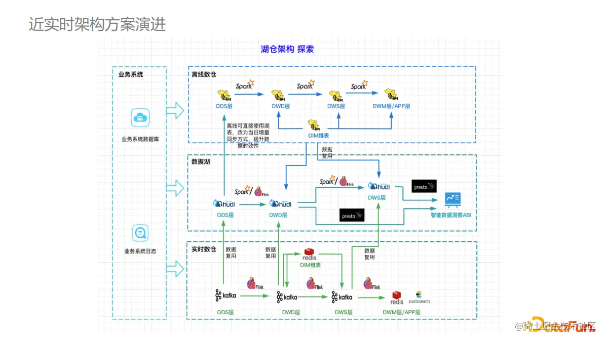 下图是基于Hudi构建的湖仓架构,该架构强调实时、离线数据的复用性(从图中虚线可以看出)。数据湖近实时同步的数据,可以通过增量的方式同步到离线数仓的 ODS 层,提升同步效率。而数据湖中的DWD和DWS层,也可以复用离线数仓中建设的维表,因为本身都是基于HDFS存储,免去了数据同步和加工的成本。此外,对于新型的业务或者是数据源,也可以将数据从业务系统导入湖中,再按照ODS到DMS分层开发。