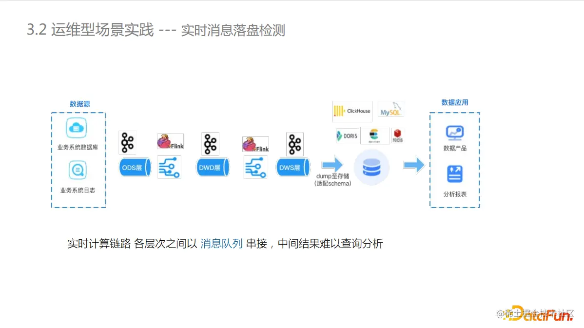 下图是大家比较熟悉的实时数据链路,和离线链路最大的不同之处在于中间的计算结果都是基于消息队列存储,不支持数据的全局观测和整体数据校验。