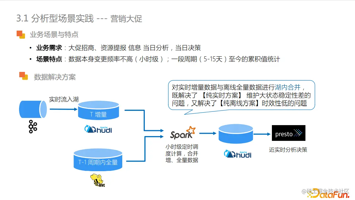 对于这类场景,近实时架构提出的解决方案是:将实时的数据流入湖,利用 Spark 进行小时级的调度,合并离线 T - 1 周期内的全量数据和T增量数据,将结果存储到数据湖中,通过Presto供实时分析决策使用。通过在湖内合并实时和离线数据,既解决了纯实时方案中大状态稳定性的问题,又解决了纯离线方案时效性低的问题。同时,这种方案充分复用了已有数据,开发和操作成本相对低廉。