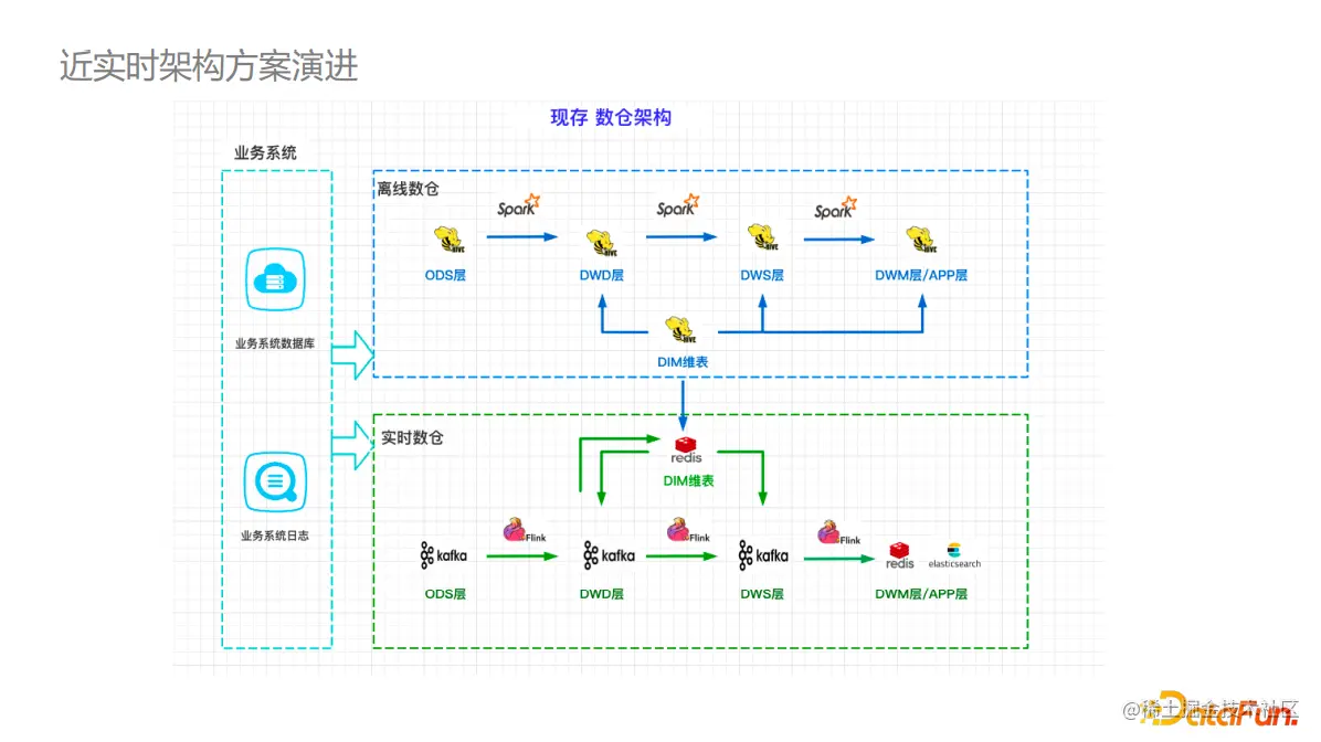 下面这张图展示的是数仓研发人员较为熟悉的离线和实时数仓的架构:从业务系统中抽取数据,ODS 层到 App 层逐层加工。离线和实时数仓的数据交互主要发生在DIM维表,对于缓慢变化的属性信息,会加工离线的数据,导入到实时的 Redis 或 HBase 存储,然后复用到实时计算中。