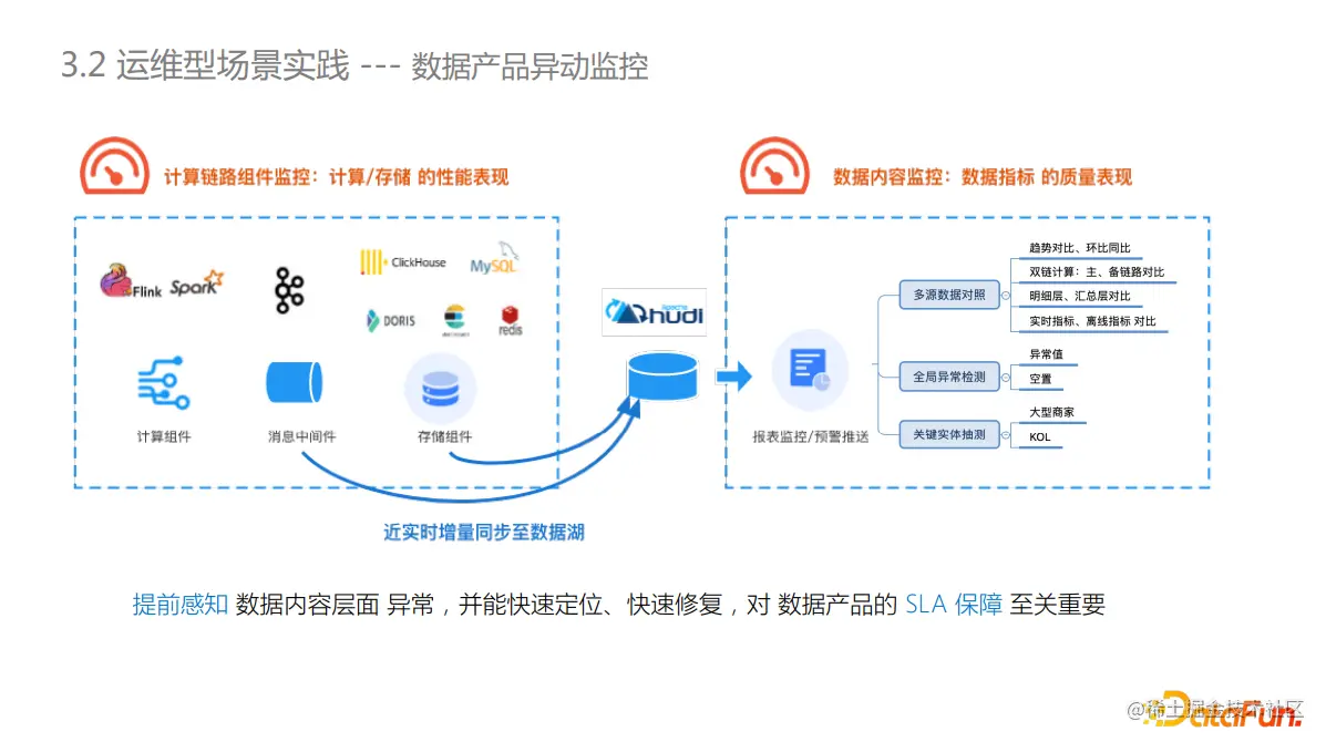 指标异动监控是数据生产中非常重要的环节,通过在数据内容层面提前感知问题,有助于问题的快速定位和解决,保障数据产出的SLA。在实践中,如果仅仅监控计算组件:比如监控 Flink、Spark 等组件metrics 、Kafka 的lag、数据库性能,并不能有效的保障数据产品的SLA。对于实时计算链路来说,由于兜底逻辑,或者源数据脏数据等原因,即使计算链路上的组件没有问题,最后呈现给用户的指标仍有可能不符合预期。为了更好的查询和分析中间结果,需要将消息队列和存储组件中的的数据落盘,以往的方式是:离线小时表的形式同步到Hive中,又或者是落盘到成本较高的OLAP数据库中。但是当前,可以通过将中间结果近实时增量同步至数据湖,在湖中支持多种类型的分析监控,比如说多数据源对照,全局异常检测,大型商家或关键 KOL达人的实体抽测等等。从而实现了操作简便、成本低廉的对数据内容的运维。