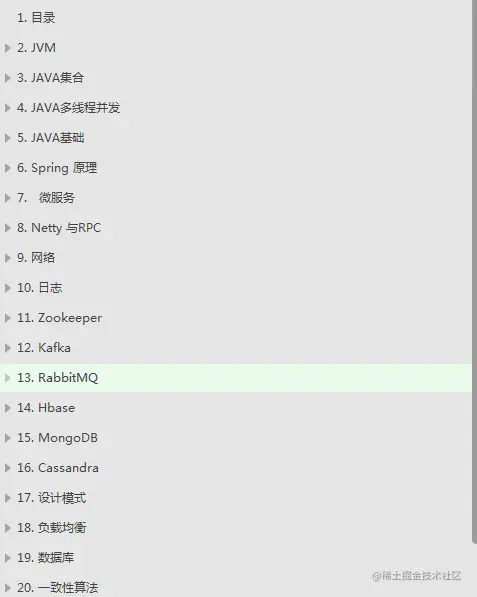 全文大致包括: Java 基础、容器、多线程、反射、对象拷贝、Java Web 、异常、网络、设计模式、Spring/Spring MVC、Spring Boot/Spring Cloud、Hibernate、MyBatis、RabbitMQ、Kafka、Zookeeper、MySQL、Redis、JVM
