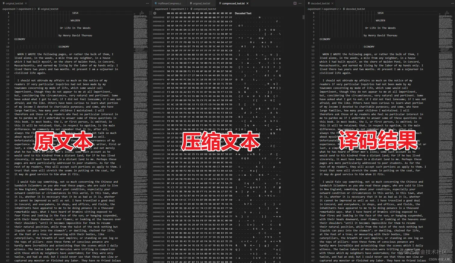 - 将哈夫曼编码文件译码为文本文件,并与原文件进行比较。
