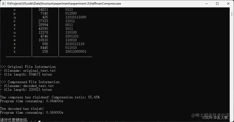 对于一篇59w个字符的小说,压缩为55.65%,压缩耗时0.064秒,译码耗时0.069秒。