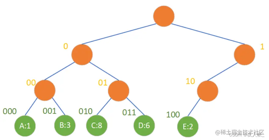 对一棵具有n个叶子结点的Haffman树,将树中的每个左分支赋0,右分支赋1,则从根到每个叶子的通路上各个分支的赋值分别构成一个二进制串,该二进制串就称为哈夫曼编码。哈夫曼编码是最优前缀编码,能使各种报文对应的二进制串的平均长度最短。