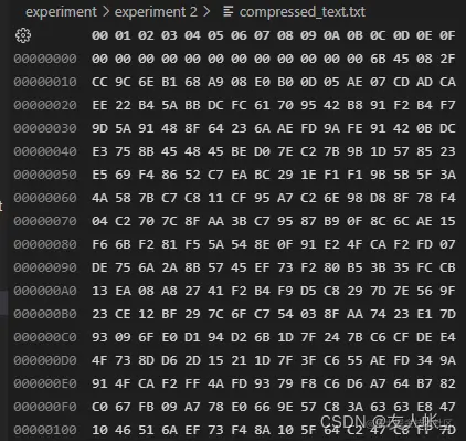 同理将文本基本信息以及字典也写入output文件中,最终得到二进制文本,实现了压缩的目的,示例如下。