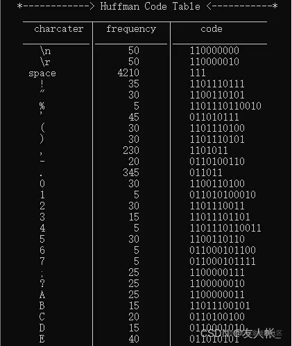因此,为生成Haffman编码,首先要对文本中每个字符出现的频率进行统计,并利用堆的结构构造了Haffman树,并生成编码。