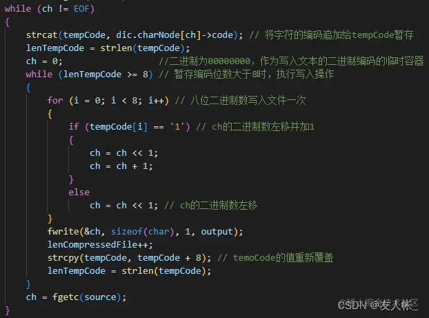 首先需要一个暂存编码的字符数组tempCode。读取正文内容,不断地将字符对应的编码追加到tempCode的末尾。当发现tempCode的长度大于8位时,将进行写入(逐字节写入)操作。