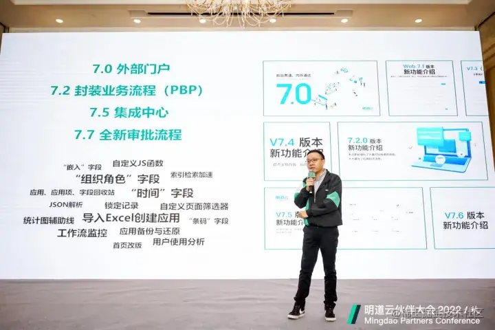 除了优秀解决方案与客户经验分享,伙伴大会也少不了2023年明道云产品路线规划介绍。明道云资深架构师田然以《“明”修栈道,暗渡“陈仓”》为题,回顾过去一年明道云的重大升级版本,并展望新一年的数据集成升级规划。