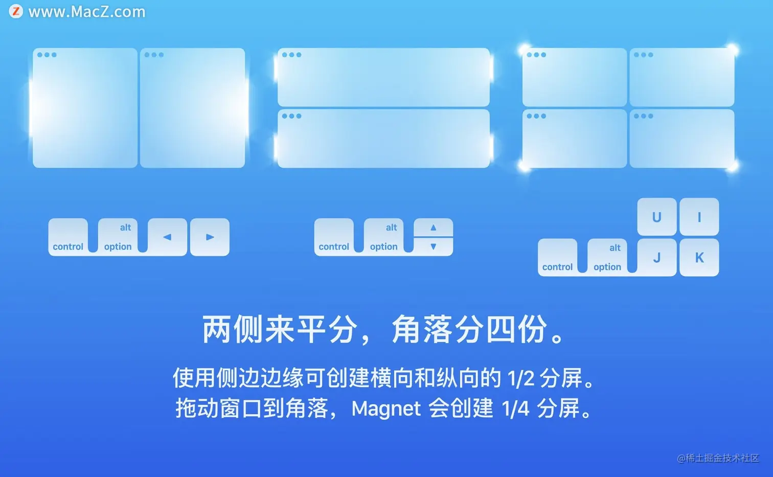 通过拖动,可自定义的键盘快捷键或通过菜单栏来激活,磁铁通过将窗口对齐到有组织的瓷砖来消除您的屏幕。复制,比较,多任务。