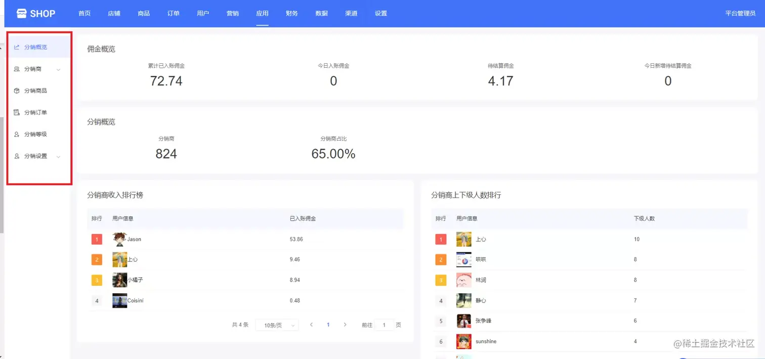分销应用中有分销概览、分销商、分销商品、分销订单、分销等级、分销设置等。