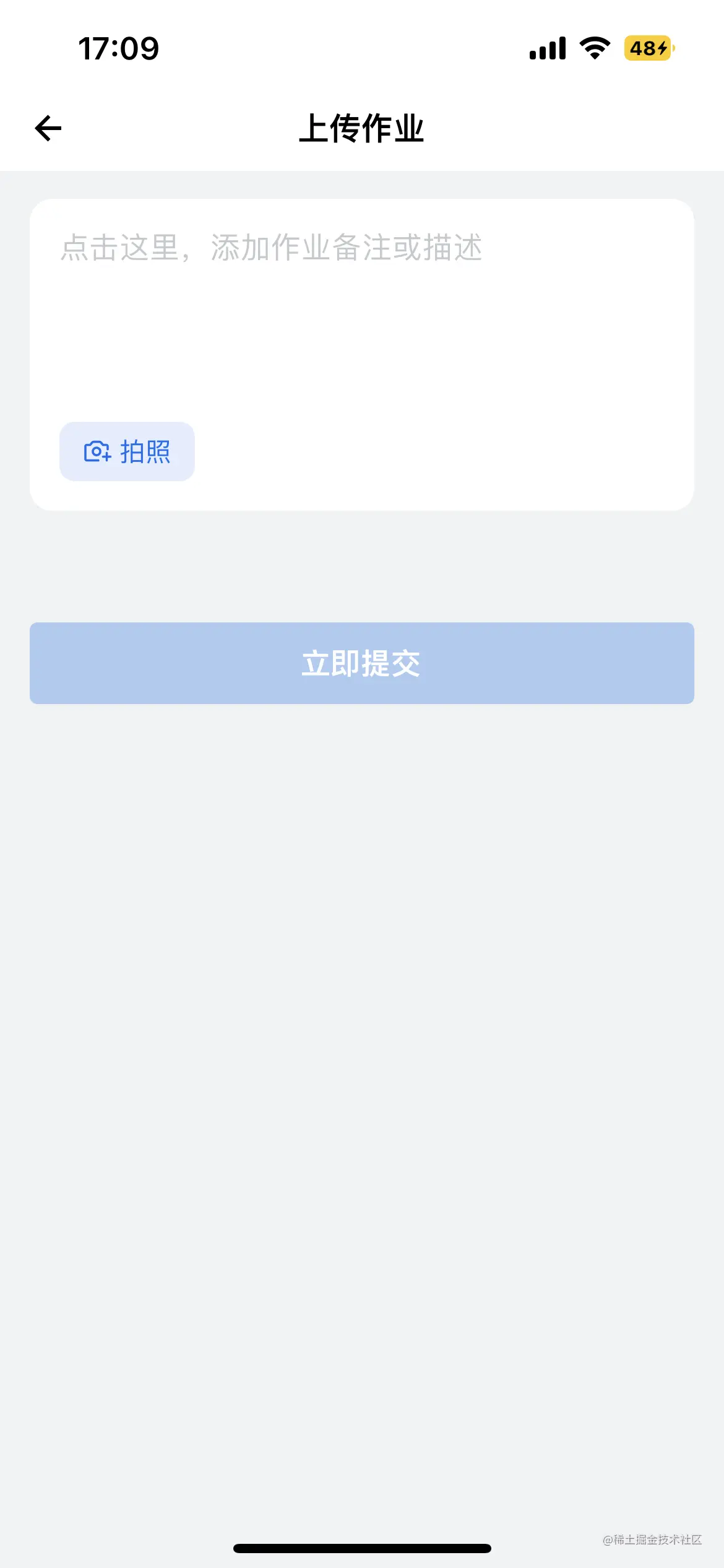 - 学生提交作业的页面,文字和图片必选其一,每个改动都会影响到底部提交按钮的状态
