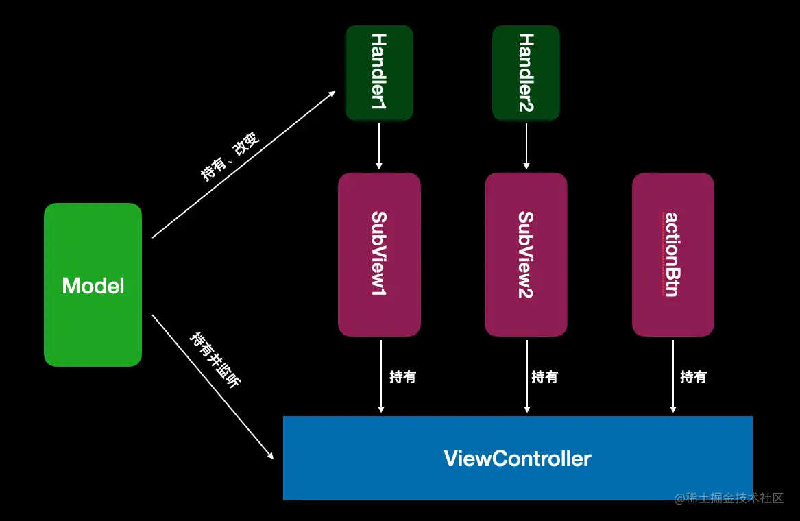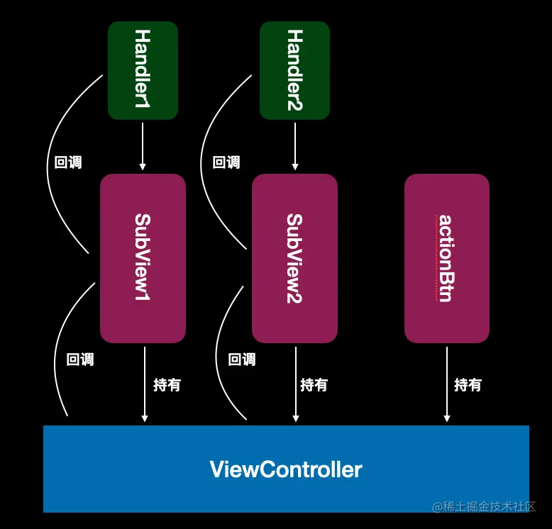 - 为了复用和解耦,我们会给 subView 添加一个逻辑处理类 (handler、viewModel、presenter)来处理 view 里面控件逻辑