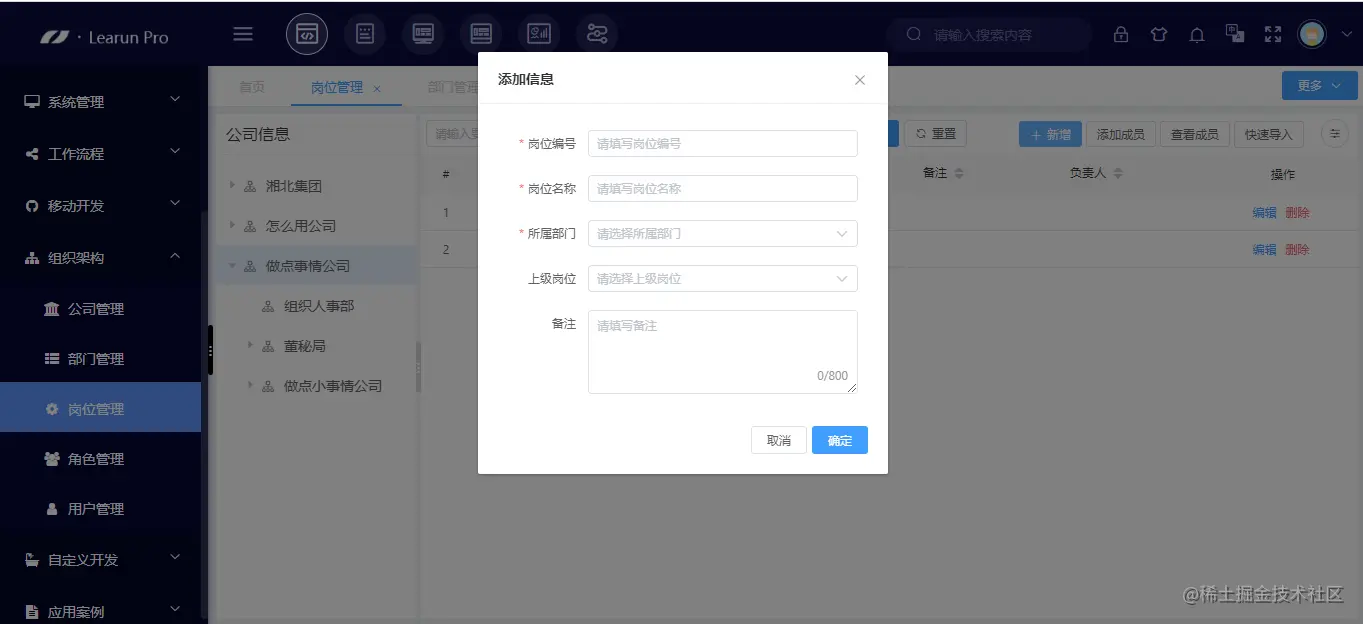具体来看,用户打开LeaRun低代码平台,进入到[组织架构]界面,点击[新增],会弹出[添加信息]的界面,然后填写公司的具体信息,名称、编码等,然后点击[保存],这样新增组织就成功了。