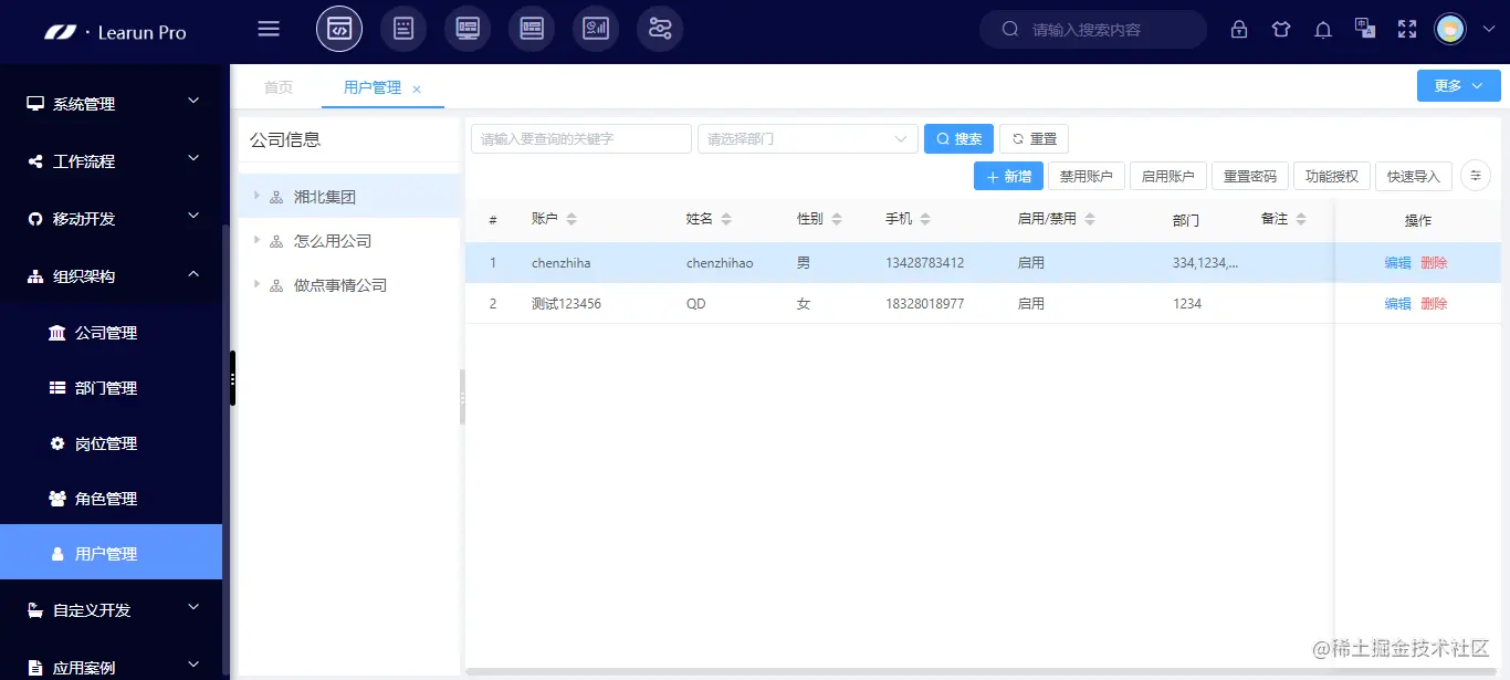[用户管理]模块与[岗位管理]相类似,用户账号新增成功以后要配置了权限才能使用,否则登录账号以后无任何权限。同时用户还可进行禁用账户、启用账户、重启密码等操作,方便维护企业信息安全。