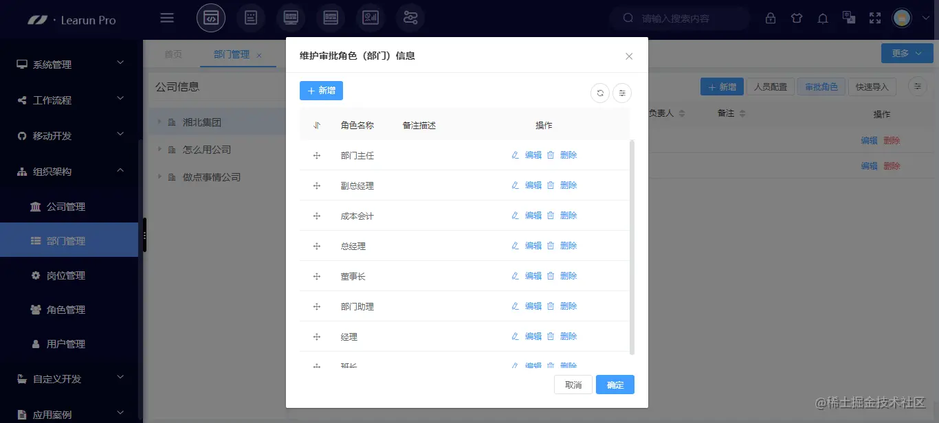 进入[部门管理]模块,用户可选择[新增]填写部门基本信息创建新部门,同时在此添加审批角色。所有部门,包括不同公司的部门都可以共用审批人员,每个部门可以在不同的角色里面添加维护对应的审批人员,该角色可以在工作流中被引用。