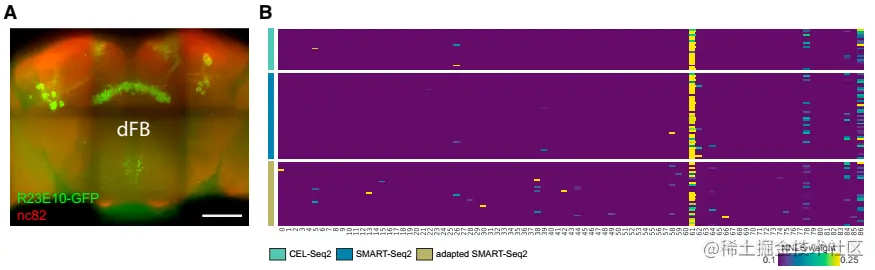 2018年cell文章“A Single-Cell Tranome Atlas of the Aging Drosophila Brain”通过Gal4品系的果蝇表达GFP:R23E10-Gal4示踪果蝇(文献中已经报道的dFB类细胞)分选出dFB类细胞细胞通过CEL-seq(22 cells)、smart-seq2(45 cells、34 cells)进行单细胞qPCR。