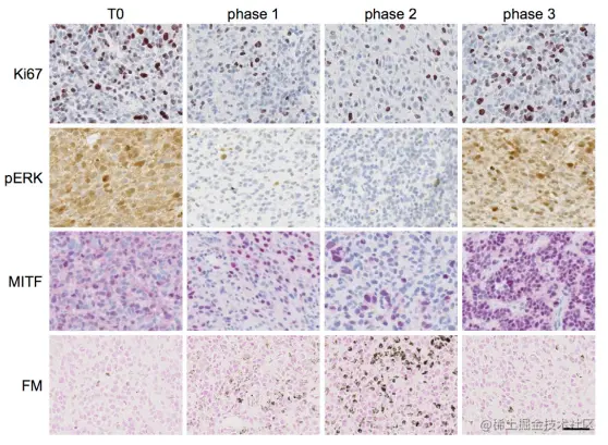 2018年cell文章“TowardMinimal Residual Disease-Directed Therapy in Melanoma”一张MITF蛋白的免疫荧光结果即是文章的证据也是整篇文章思路的源泉。作者从MITF在组织中的异质性表达整理出来了整篇单细胞文章的思路,揭示出了黑色素瘤微小残留耐药的重要原因。
