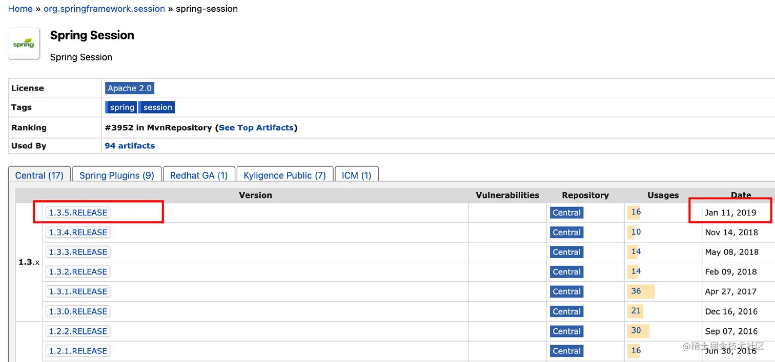 spring-session使用的是1.3.5.RELEASE,但是打开 Maven 仓库一看,这居然是最新版本?而且还是 2019 年的版本?