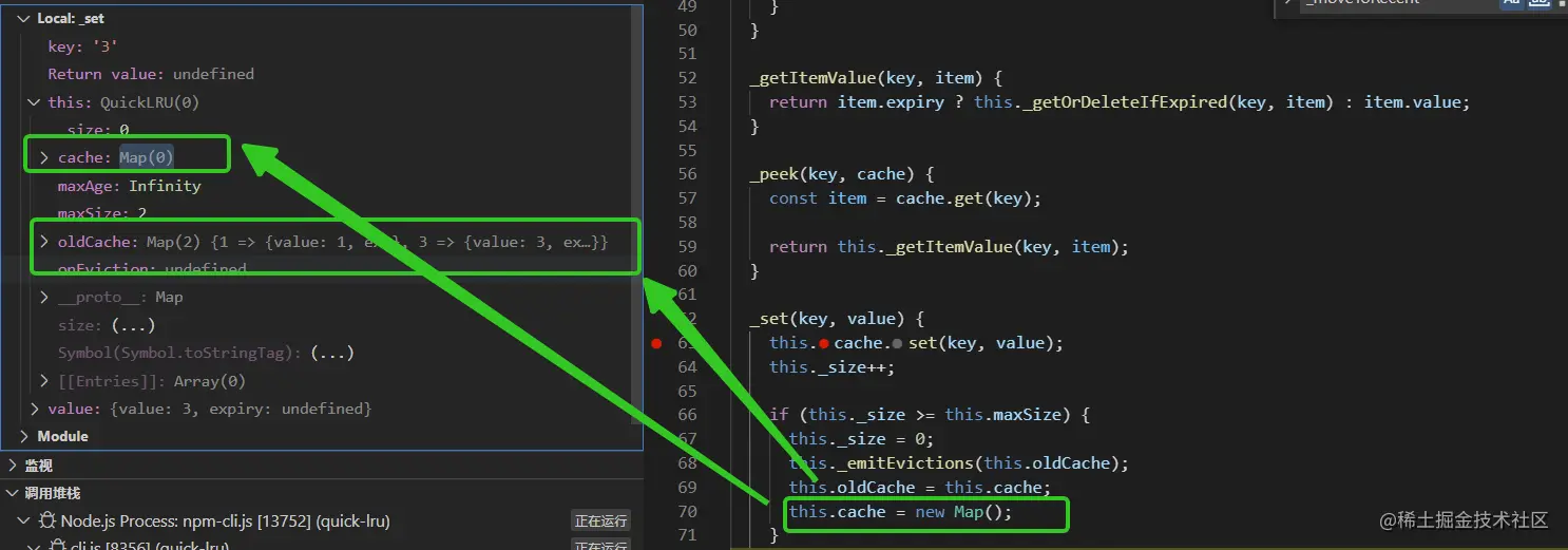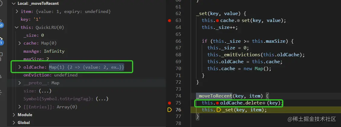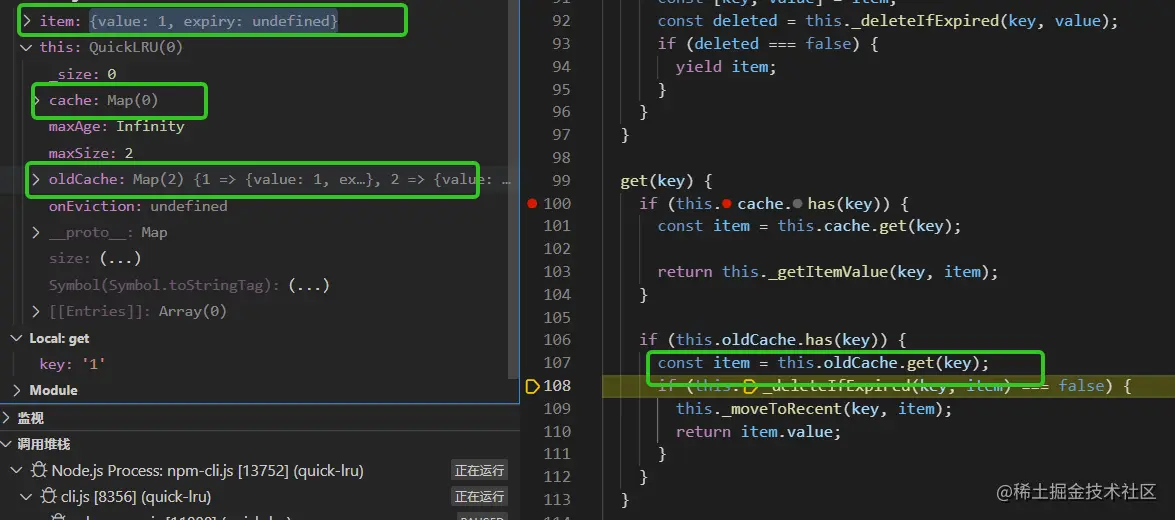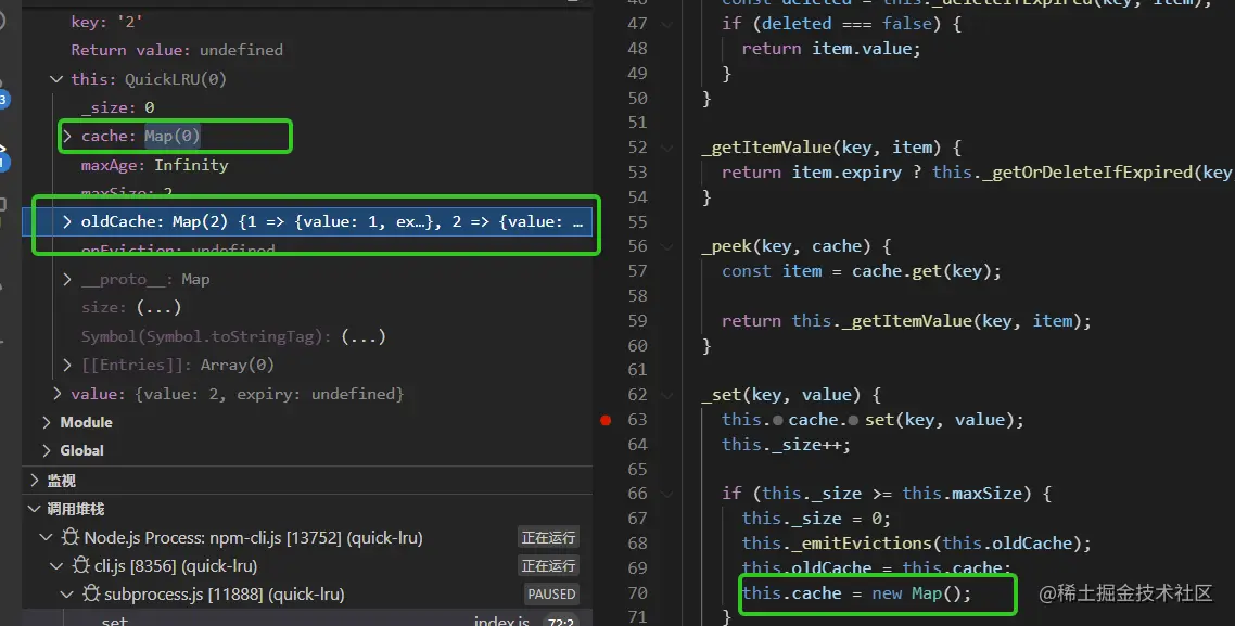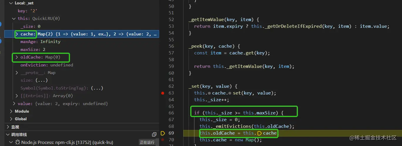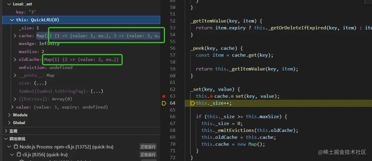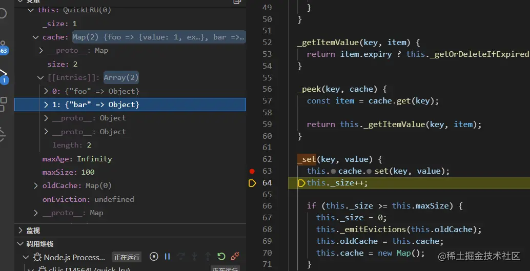 测试用例是test.js (quick-lru/test.js),以两个测试用例的执行过程来加深对quick-lru的理解,关于如何调试可以参考川哥的文章(juejin.cn/post/703058…)。