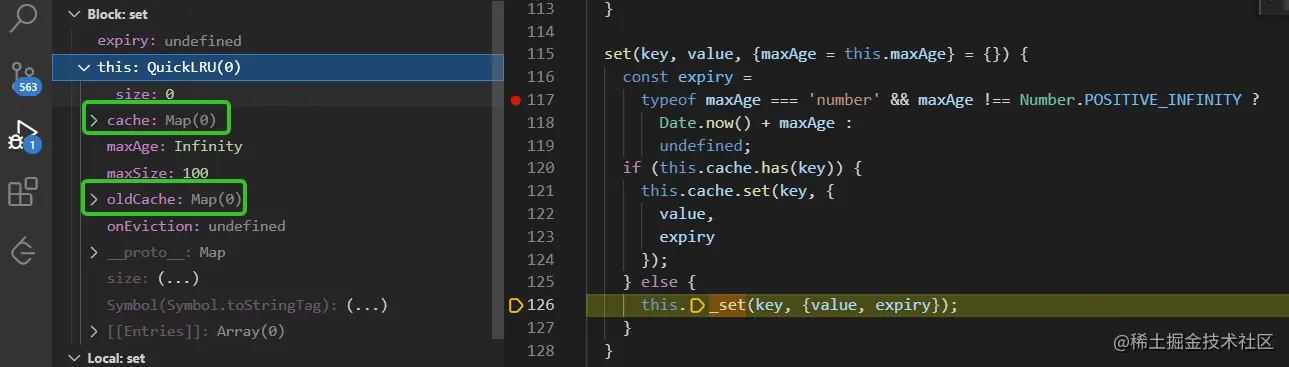 执行set方法时又会调用_set方法,此时cache和oldCache都为空的map ,如下图: