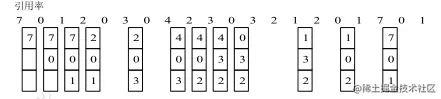 (1)当引用页面7时,没命中(没在存储空间中),存储空间有位置,放进去;