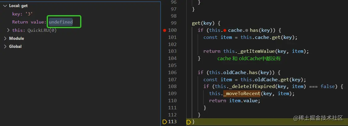 执行 t.is(lru.get('3'), undefined);会调用get方法,获取3对应的元素,在cache和oldCache中都没有查找到,返回undefined,如下图所示: