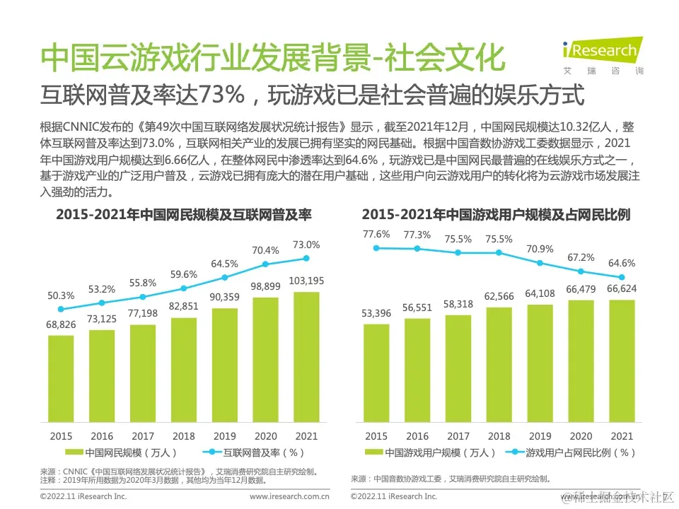 报告认为,中国云游戏产业发展的背景,除了互联网本身的高渗透率(报告中引用的数据显示,2021年中国互联网普及率达到73%),游戏用户在网民中的比例也非常高(根据中国音协游戏工作委员会的数据, 2021年我国游戏用户规模达到6.6624亿,虽然游戏用户占比达到64.6%,但从2015~2021年开始逐渐下降)。作为数字经济的一种形式,它也得到了国家政策的支持。