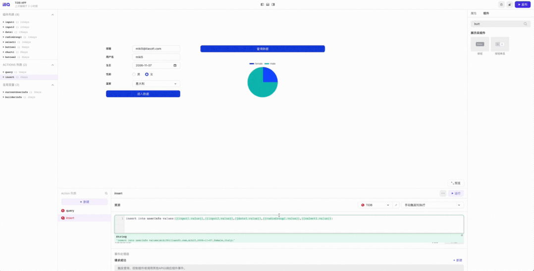 ILLA Builder是ILLA的核心产品,是一款开源的低代码开发工具。通过组件(Components)可以在画布实现多种功能,丰富的组件库可以快速的实现各种常见功能。通过Action功能,可以快速连接Mysql,PostgreSQL,Redis,RestAPI等常用数据库和数据源,帮助开发者快速实现增删改查能力。