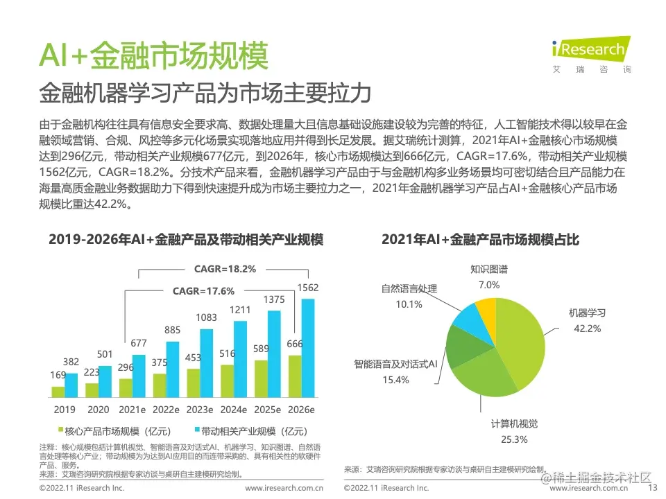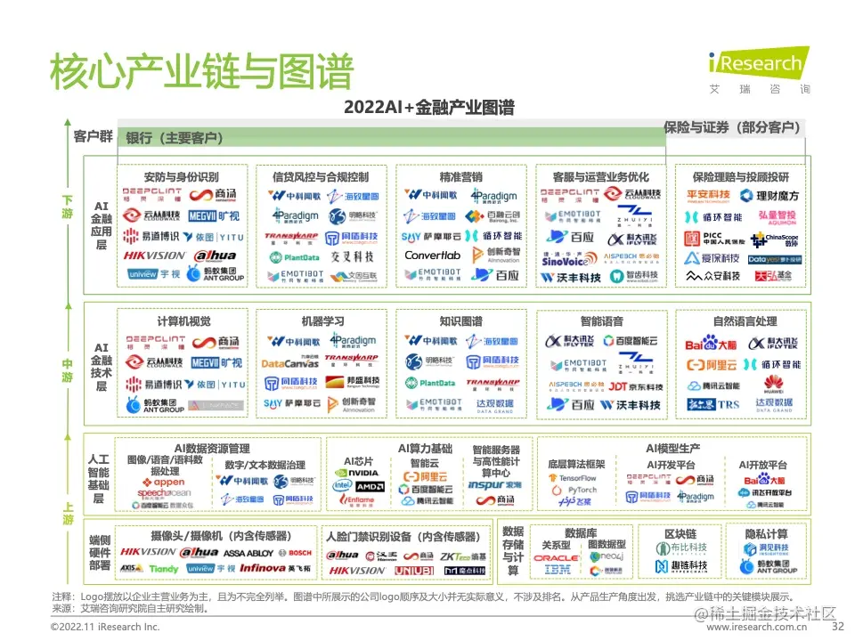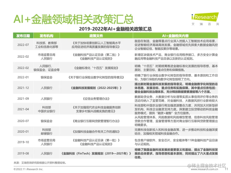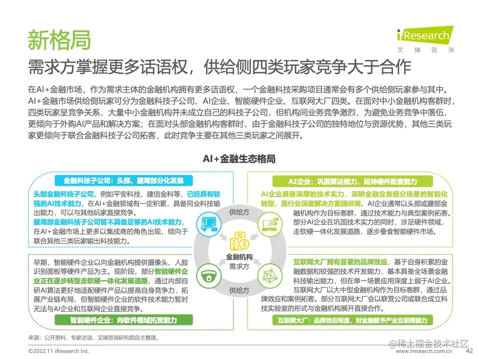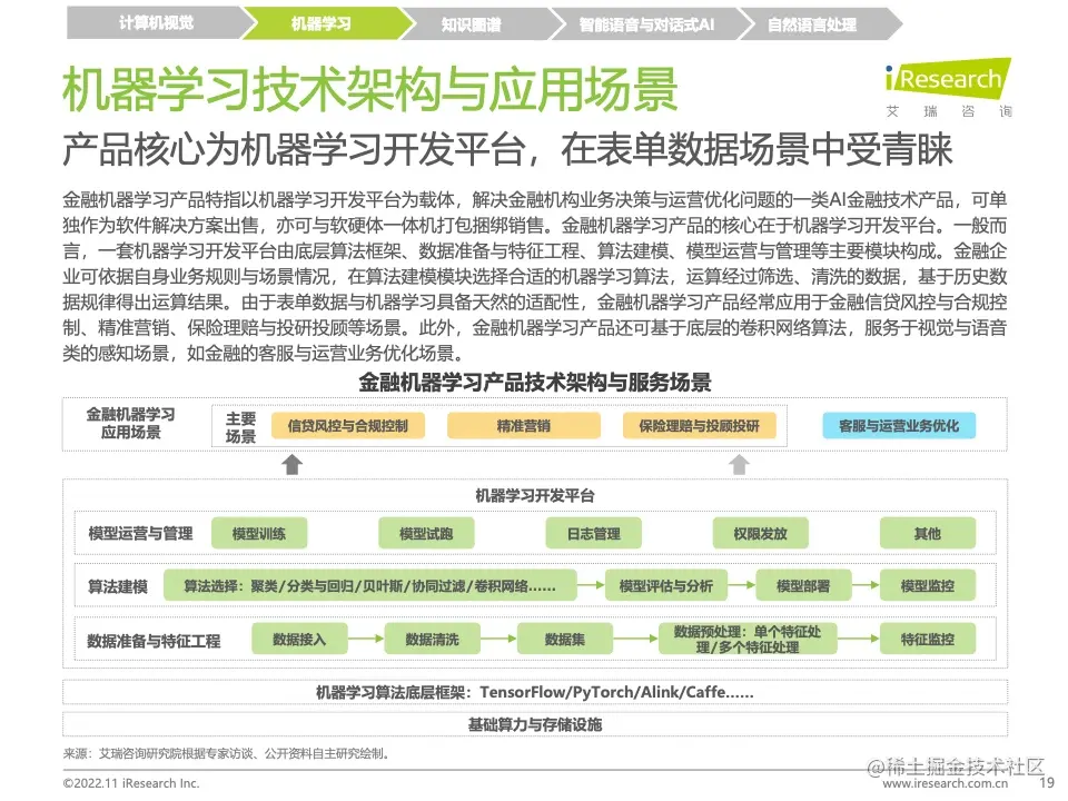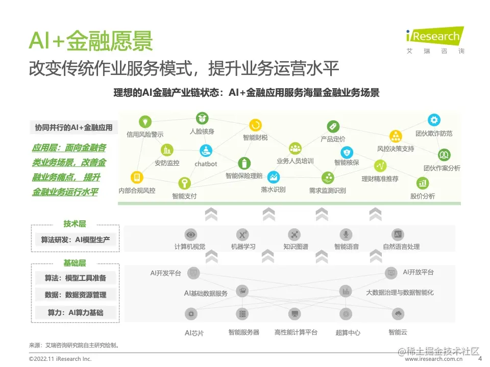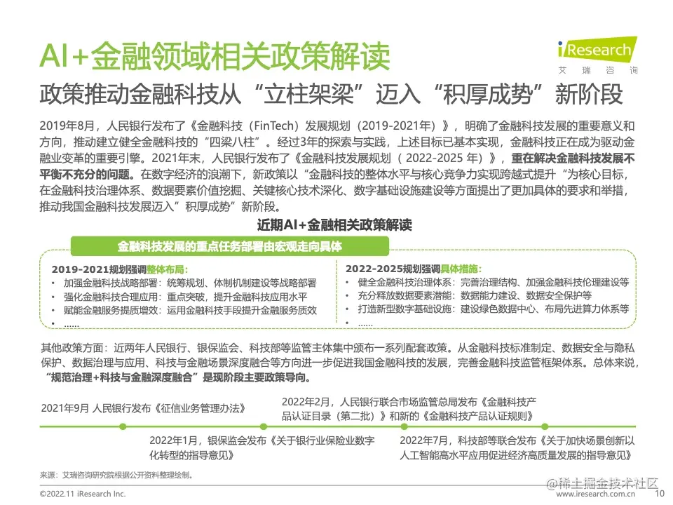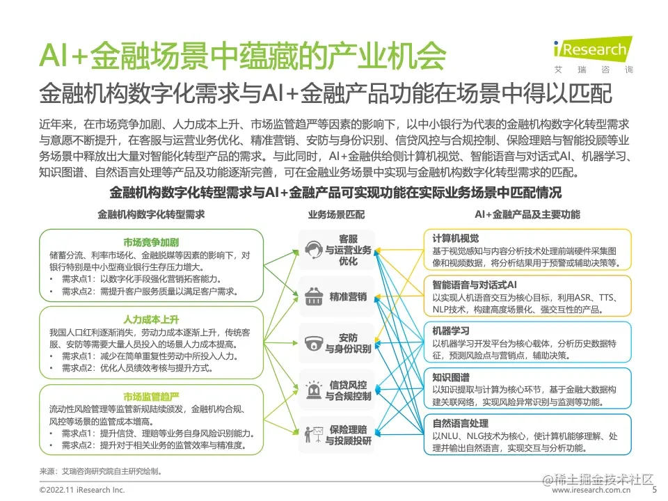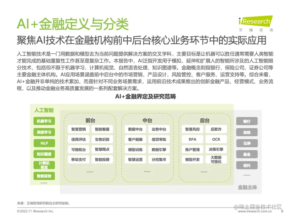 近年来,金融科技新政不断出台,AI技术不断迭代升级,AI金融产业链玩家角色动态演进,AI技术与金融业务场景呈现深度融合发展的新趋势。对此,艾瑞咨询发布《2022中国AI+金融行业发展研究报告》,深入分析AI技术在计算机视觉、机器学习、知识图谱、智能语音与对话AI、自然语言处理等金融领域的应用场景和市场规模,探讨AI技术赋能金融业务发展的新趋势, 最后对AI+金融行业发展的格局和机遇进行了洞察。希望通过这份报告,向读者呈现2022年AI+金融行业发展的动态和亮点,并提供识别和判断AI+金融行业趋势的方法。