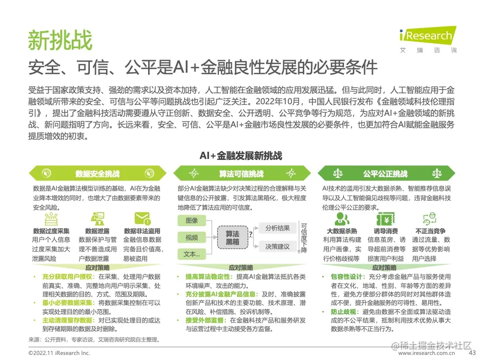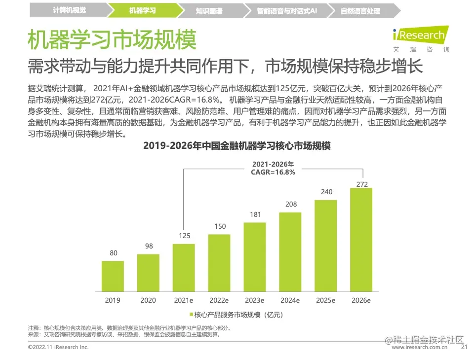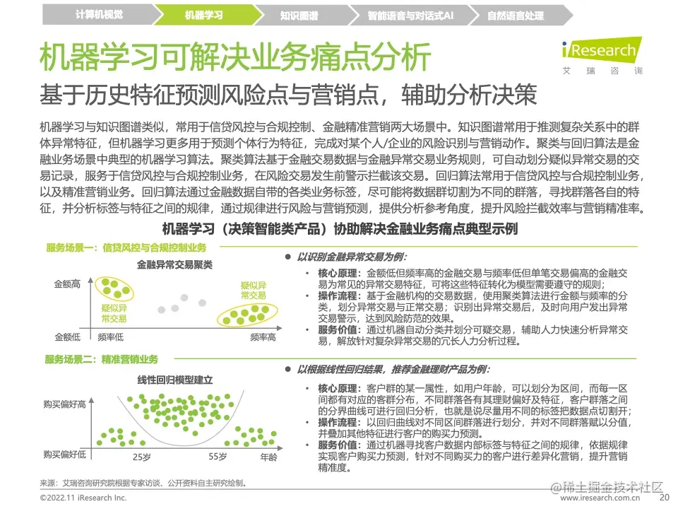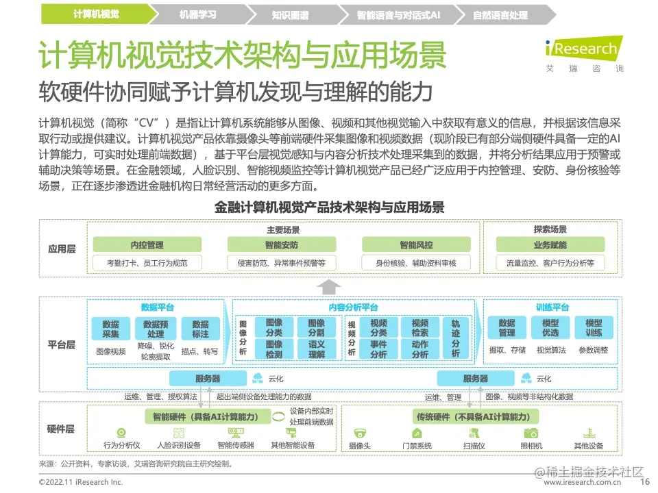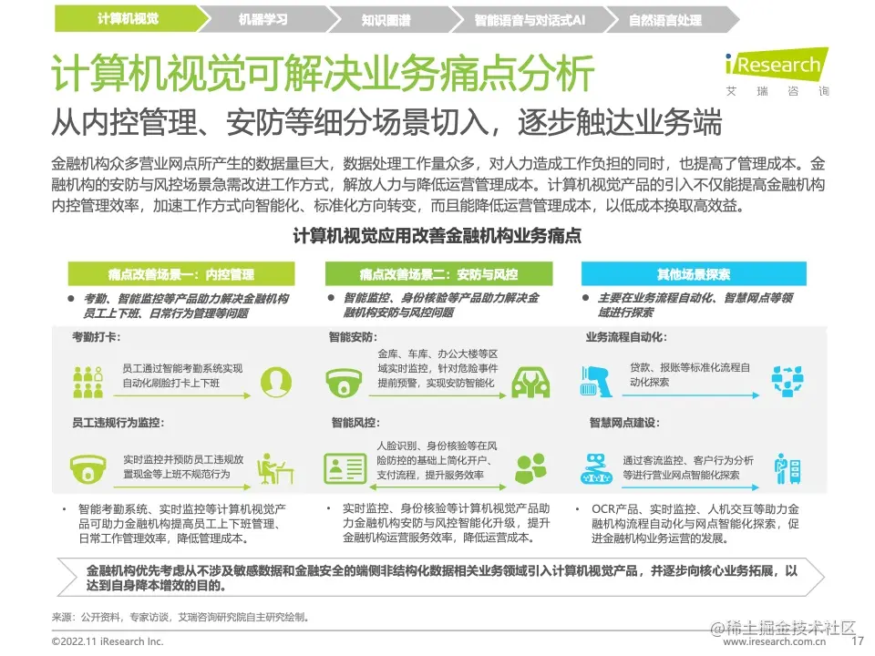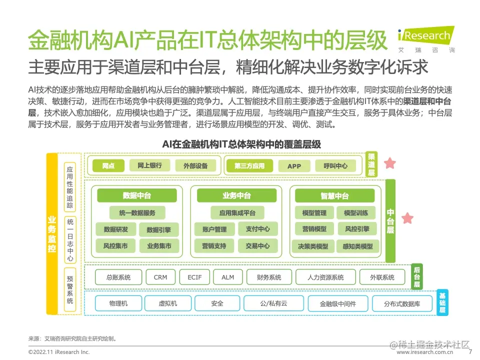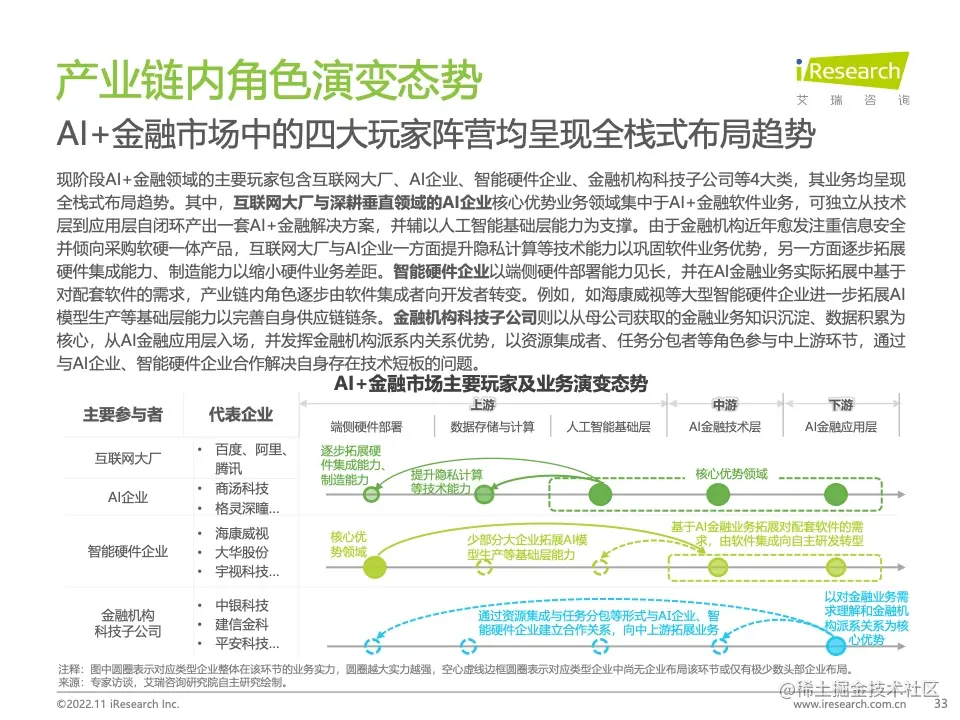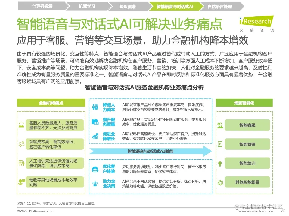 近年来,金融科技新政不断出台,AI技术不断迭代升级,AI金融产业链玩家角色动态演进,AI技术与金融业务场景呈现深度融合发展的新趋势。对此,艾瑞咨询发布《2022中国AI+金融行业发展研究报告》,深入分析AI技术在计算机视觉、机器学习、知识图谱、智能语音与对话AI、自然语言处理等金融领域的应用场景和市场规模,探讨AI技术赋能金融业务发展的新趋势, 最后对AI+金融行业发展的格局和机遇进行了洞察。希望通过这份报告,向读者呈现2022年AI+金融行业发展的动态和亮点,并提供识别和判断AI+金融行业趋势的方法。