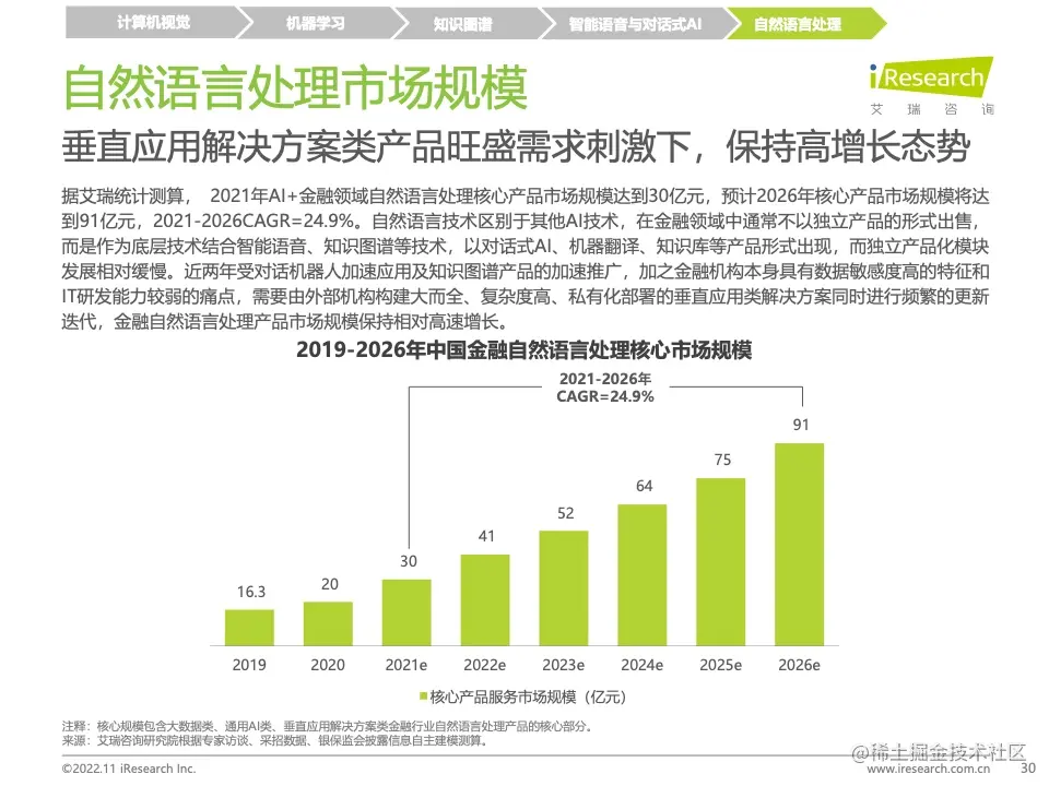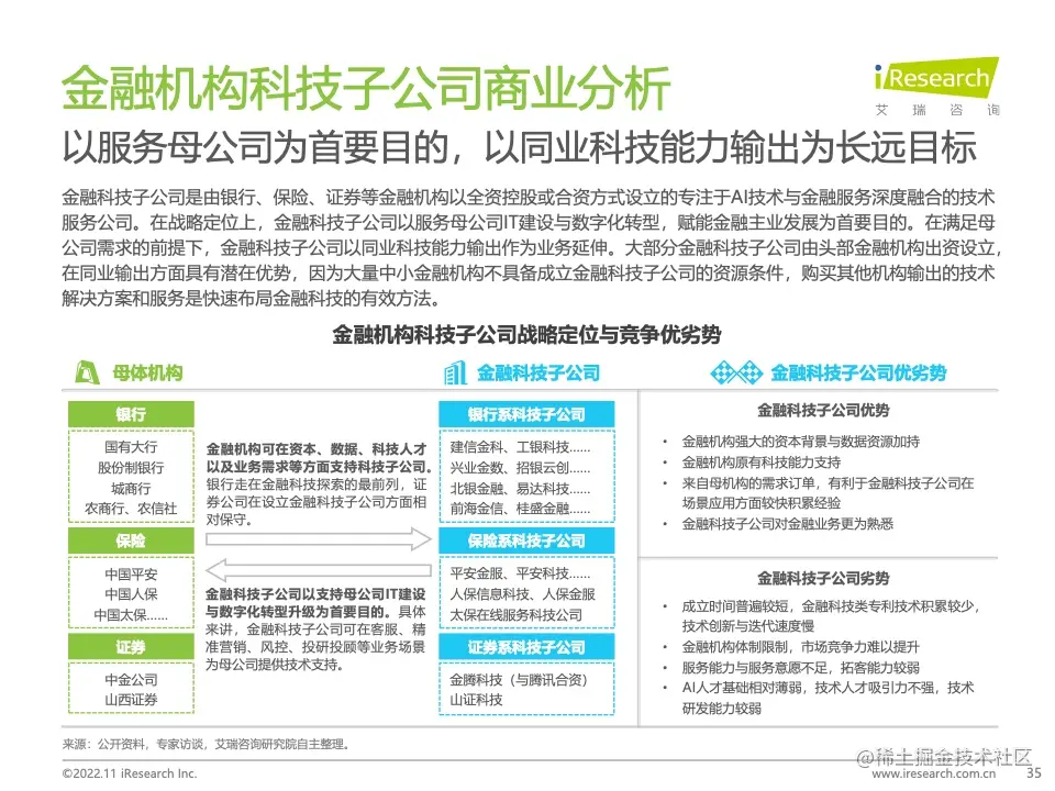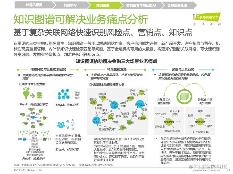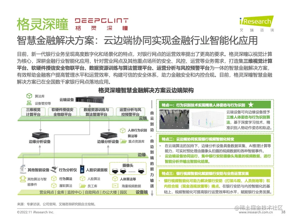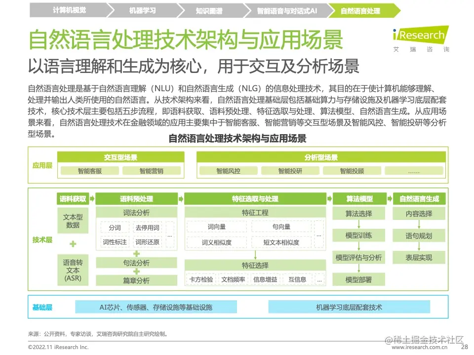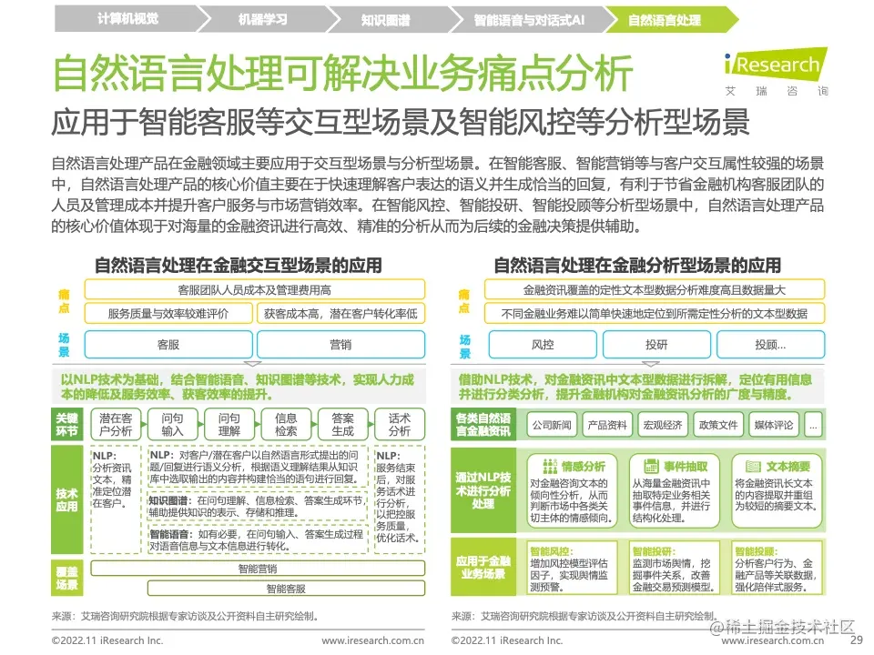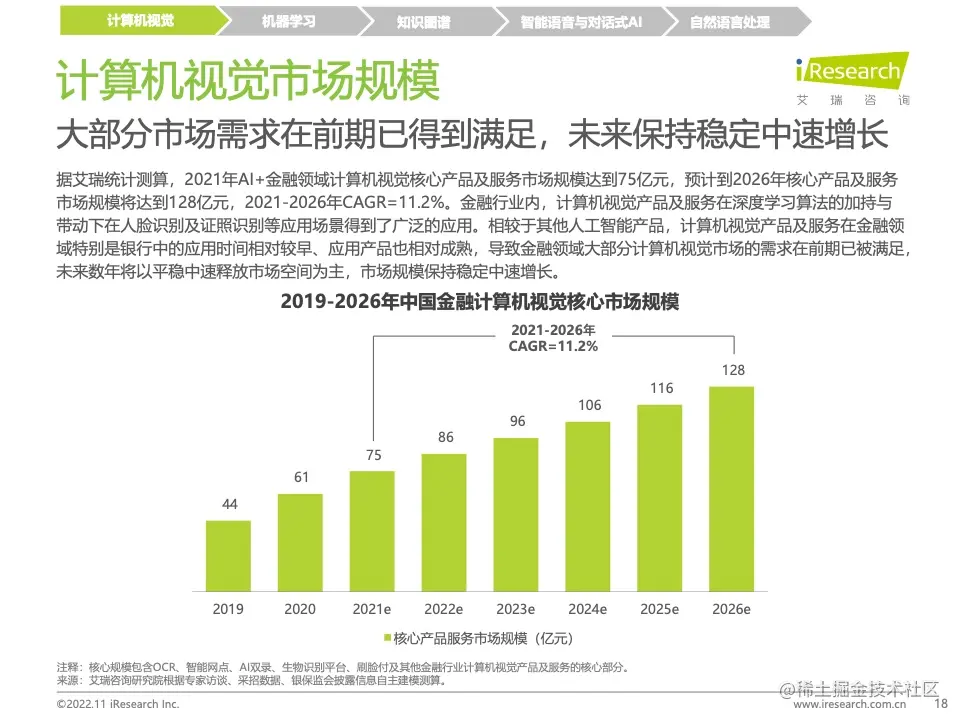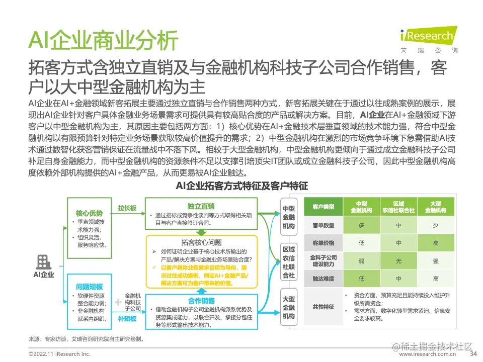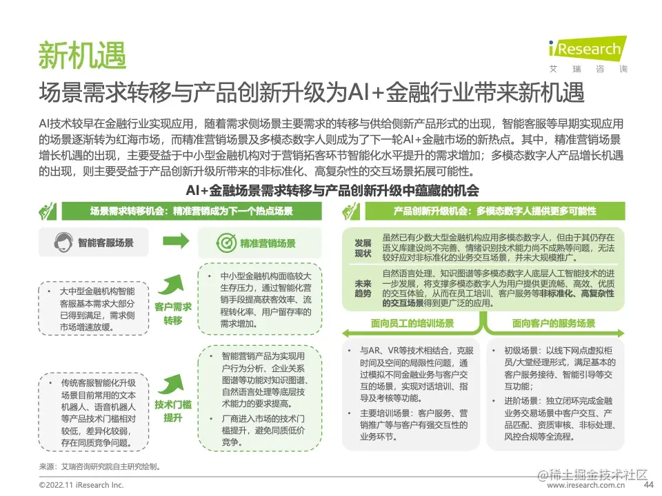 近年来,金融科技新政不断出台,AI技术不断迭代升级,AI金融产业链玩家角色动态演进,AI技术与金融业务场景呈现深度融合发展的新趋势。对此,艾瑞咨询发布《2022中国AI+金融行业发展研究报告》,深入分析AI技术在计算机视觉、机器学习、知识图谱、智能语音与对话AI、自然语言处理等金融领域的应用场景和市场规模,探讨AI技术赋能金融业务发展的新趋势, 最后对AI+金融行业发展的格局和机遇进行了洞察。希望通过这份报告,向读者呈现2022年AI+金融行业发展的动态和亮点,并提供识别和判断AI+金融行业趋势的方法。