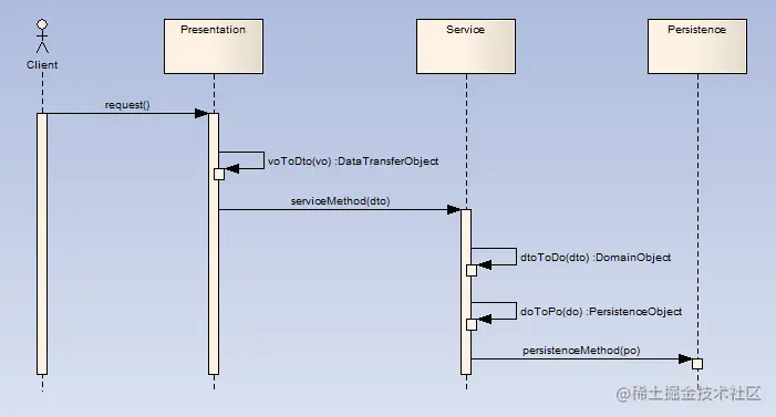 - 服务层把DO转换为持久层对应的PO(可以使用ORM工具,也可以不用),调用持久层的持久化方法,把PO传递给它,完成持久化操作。