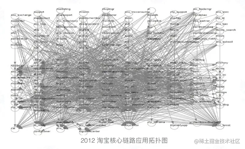 接下来给大家看一张在2012年淘宝核心链路的应用拓扑图,给大家看一下真实的后端服务是什么样子的。
