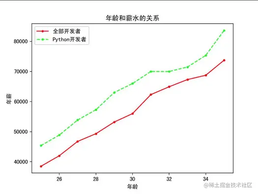 上面的代码中,我们通过 color 参数指定图形的颜色,marker 参数指定每个数据点的标记,linestyle 参数指定图形的形状。执行完上述代码后的图形如下图所示: