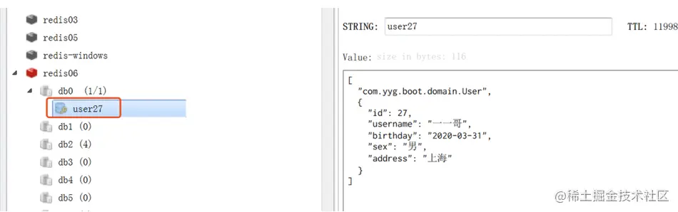 这时候我们再次去Redis DesktopManager中查看,会发现Redis中已经有了一条缓存的数据,就是我们刚才从MySQL中查询过来的用户信息。