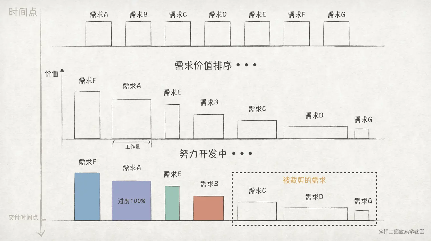 这样,我们就能大致估算出每个需求的价值,然后对需求做价值的优先排序,最后根据当前的开发人力做需求裁剪。确保在交付时间点到时,我们能够为客户提供一个可用的、价值最大的软件系统。