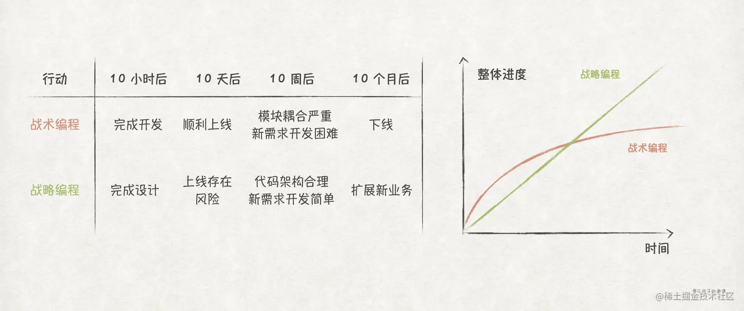 比如,在《一步步降低软件复杂性》提到的 战术编程 与 战略编程 的例子,我们总是偏向战术编程,因为它能够节省大量开发时间,更快地完成需求交付。但是,当你从时间的维度来考虑时,结果就会有所不同: