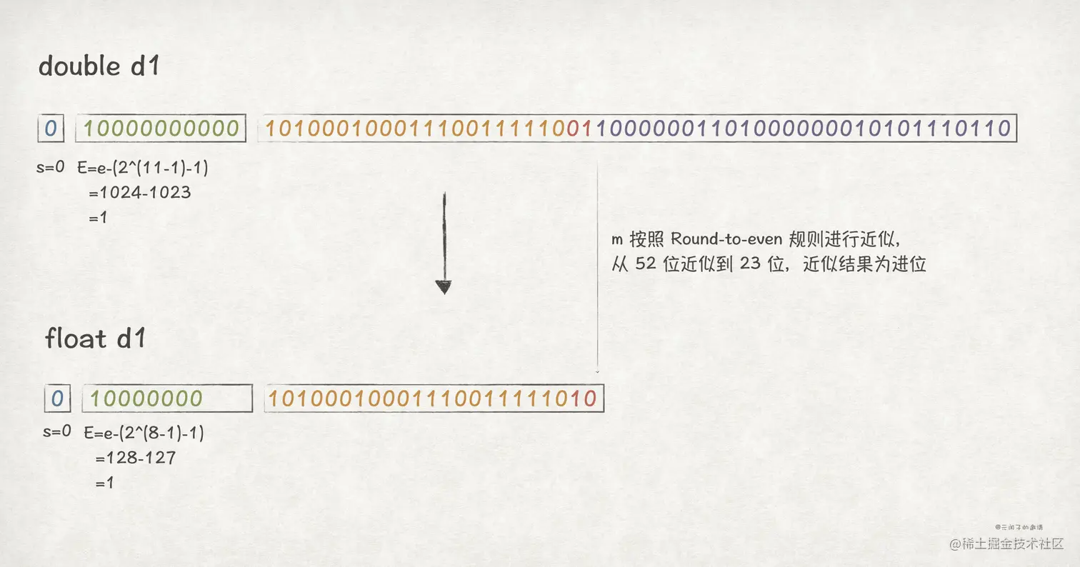 double到float的近似规则是 Round-to-even,但3.267393471324506到3.2673936也不符合这个规则。然后想,有没可能近似规则是用在二进制的表示上? - 继续查阅 《Java 语言规范》,发现计算机的浮点数实现都遵循着《IEEE Standard 754 Floating-Point Representation》 规范。