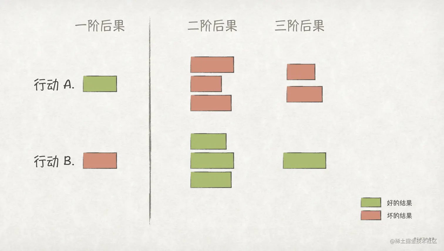 我们的每一个行动都会导致一个后果,而每个后果,都会有进一步导致其他的后果。由行动直接导致的后果,我们称为一阶后果(First-Order Consequences);由一阶后果导致的,二阶、三阶… 后果,这里,我们统称为二阶后果(Second-Order Consequences)。